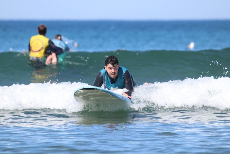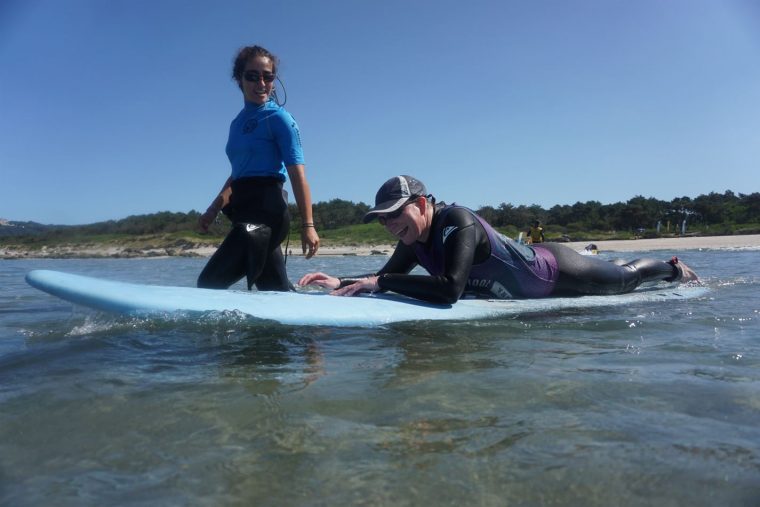 Todos aportábamos y todos aprendíamos. Además de la ayuda en los traslados, el acceso al mar con silla anfibia y mejorar la posición-técnica en las olas, vimos formas de adaptar la tabla con diversos relieves para poderse posicionar correctamente cuando tienes discapacidad visual. También medios de sujeción de los miembros inferiores para las diferentes lesiones medulares o falta de movilidad por otras causas como el daño cerebral. Una metodología centrada en la persona con un profesor para cada persona con discapacidad que potencie y ayude de tal manera que el participante se sienta y esté más seguro.