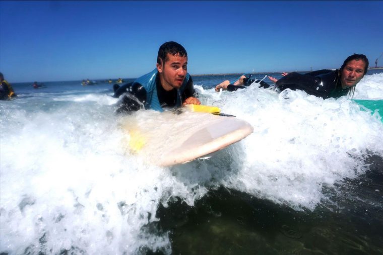 La ansiada práctica de surf vino el domingo junto a compañeros portugueses y alemanes (Open Ocean). Ya que los alemanes hacen allí un campamento inclusivo llamado «Open Ocean» en el que participan discapacidad física y visual. Lo hicimos desde el punto de partida de la diversidad, puesto que además de tener todos diferentes capacidades, también hablamos diferentes idiomas (Portugal, alemán, español …), pero fue precioso ver cómo dentro del agua hay un idioma universal que es el de disfrutar, y aprender juntos a entendernos con sonrisas, miradas, para así poder ayudarnos a mejorar en este precioso deporte.