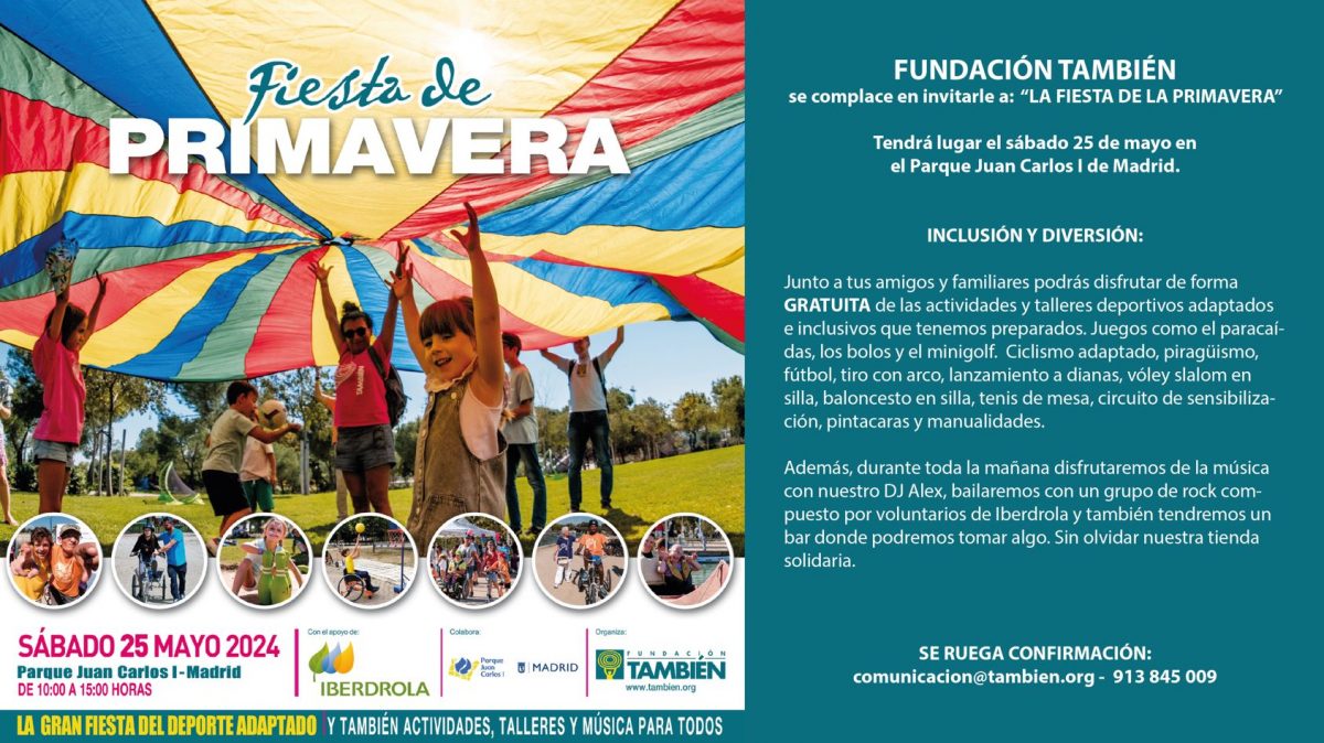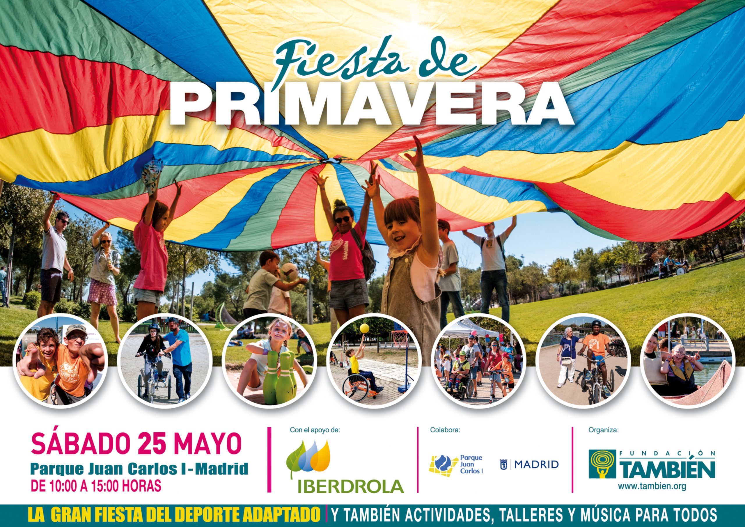 ¡Ven a pasarlo en grande a la gran fiesta de la primavera, ES GRATIS! Tendrá lugar el sábado 25 de mayo a las 10 de la mañana y hasta las 15 de la tarde. La “Fundación También” celebrará esta jornada por y para la inclusión con el apoyo de Iberdrola y sus voluntarios. Una mañana dirigida a todos los públicos, niños y mayores, con y sin discapacidad, unidos para disfrutar realizando todo tipo de deportes inclusivos: ciclismo, baloncesto, fútbol, tenis de mesa, boccia, lanzamientos a diana, bolos, tiro con arco, pesca de feria, slalom en silla, minigolf, piraguas, etc.