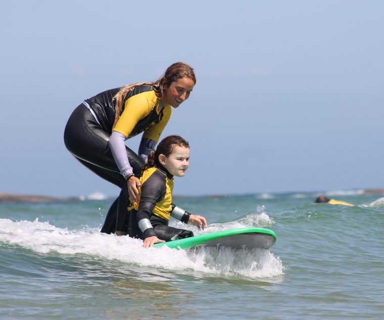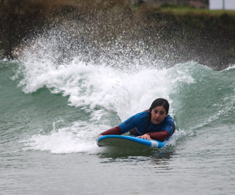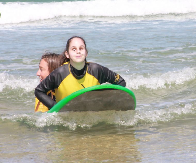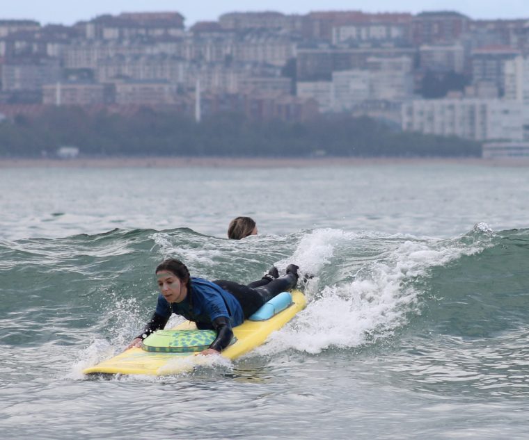 Esta vez, en el curso de iniciación que organizamos participaron, Ángela, una niña de 8 años a la que le faltan las dos piernas, con su don para los deportes y su capacidad de disfrute en todo lo que hace, junto a su padre Javi. Ismael, para el que era la primera vez que subía a una tabla y al que sus ganas y empatía le permitieron disfrutar por encima de sus expectativas. Aroa, una niña con discapacidad visual total, que tiene una gran capacidad de superación y positividad logró mantenerse en la tabla, pese a que se estrenaba en el parasurf. Fátima nos alegró con su energía y sonrisa infinita y Emilio y su hija Lucía con su capacidad de hipnotizarnos cuando están dentro del agua, nos demostraron que con esfuerzo disfrute y sonrisas todo se puede.