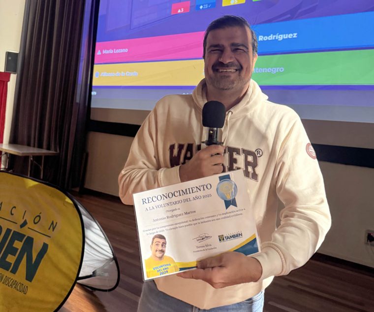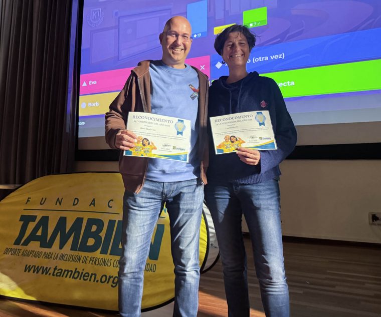 Un momento muy especial es cuando elegimos a nuestro voluntario del año para agradecer su compromiso y dedicación en todas las actividades en las que nos acompañan. Antonio Rodríguez, nuestro voluntario del año 2025 dejó muy alto el podio con su incombustible sonrisa mientras nos acompaña en escalada, buceo, esquí y lo que se tercie, porque no hay nada que no pueda hacer Antonio, bien lo sabe Papá Noel… El testigo lo cogieron sorprendidos Eva y Boris Manievski, estos queridos hermanos llevan haciéndonos pasar buenos ratos desde hace muchísimos años y nos emociona muchísimo siempre que los tenemos cerca con su enorme compromiso y ganas de ayudar. ¡Enhorabuena! ¿Quieres ser tú el siguiente?