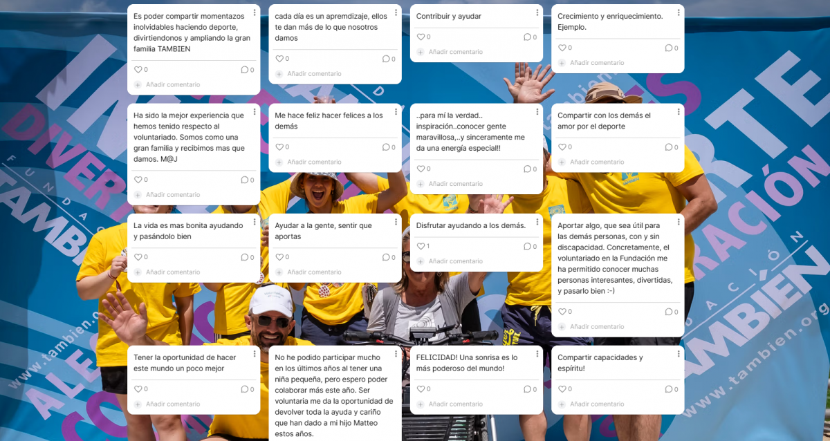 Los valoramos muchísimo y cuidarlos es algo que siempre intentamos en cada actividad que disfrutamos con ellos, valoramos todo el tiempo que pasan con nosotros y otra manera de cuidar es ofrecer formaciones que nos descubran nuevas prácticas. ¿Qué mejor manera de empezar que mediante una encuesta que nos ayudó a conocernos mejor y compartir unas risas? Así respondían a la pregunta de qué significa para ti ser voluntario de Fundación También: