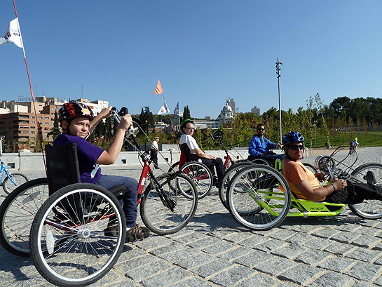 Los miércoles por la tarde y los sábados por la mañana tienes una cita en nuestra sede permanente del Parque Juan Carlos I de Madrid. Allí se puede disponer de bicicletas adaptadas porque la Fundación También ha sido la primera y la única entidad que organiza de forma permanente actividades de ciclismo adaptado en nuestro país, tanto en la capital como fuera de ella, y para lo que cuenta con el compromiso de Fundación Repsol.
